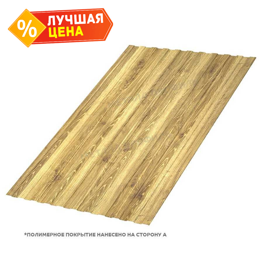 Профлист с двусторонним покрытием ECOSTEEL® в оттенке текстурированного Золотого Дуба представляет собой надежный материал для ограждений и фасадов. Толщиной 0,5 мм и профилем С-8, он сочетает эстетику натурального дерева с прочностью металла, обеспечивая долговечность и элегантный вид.